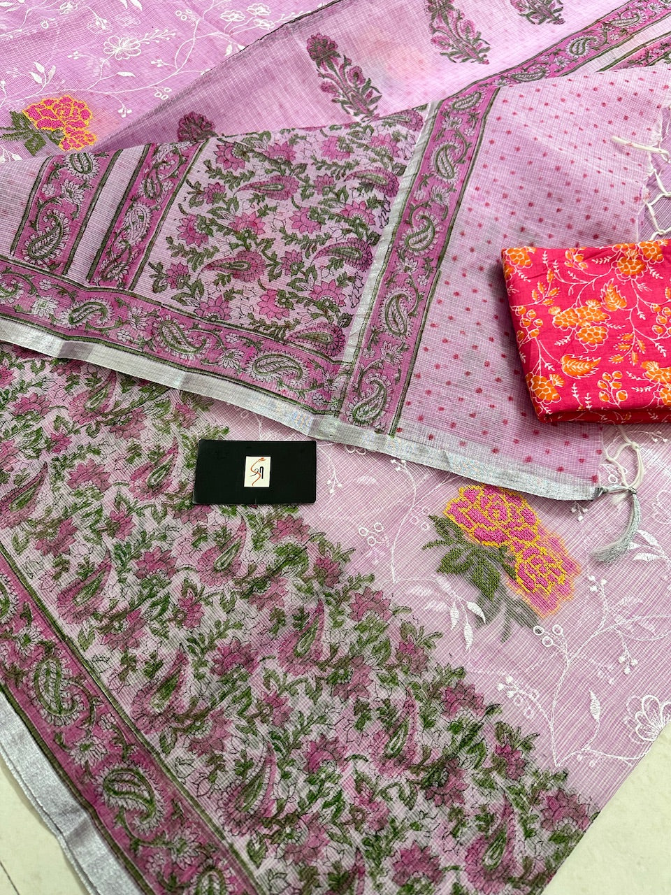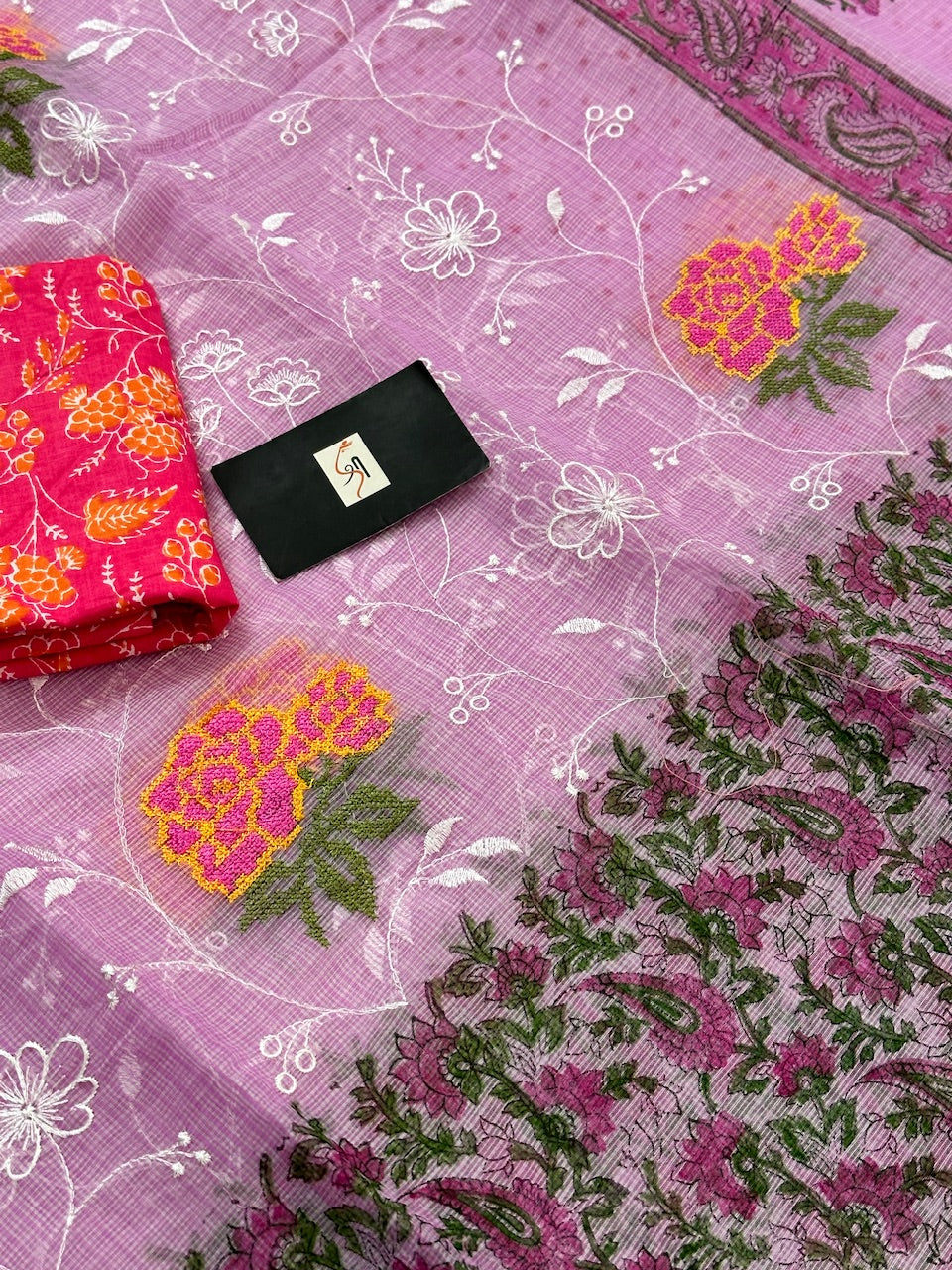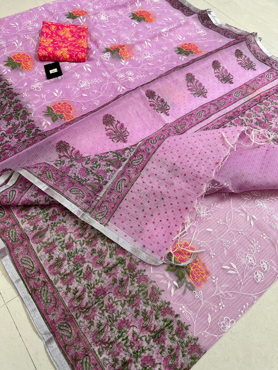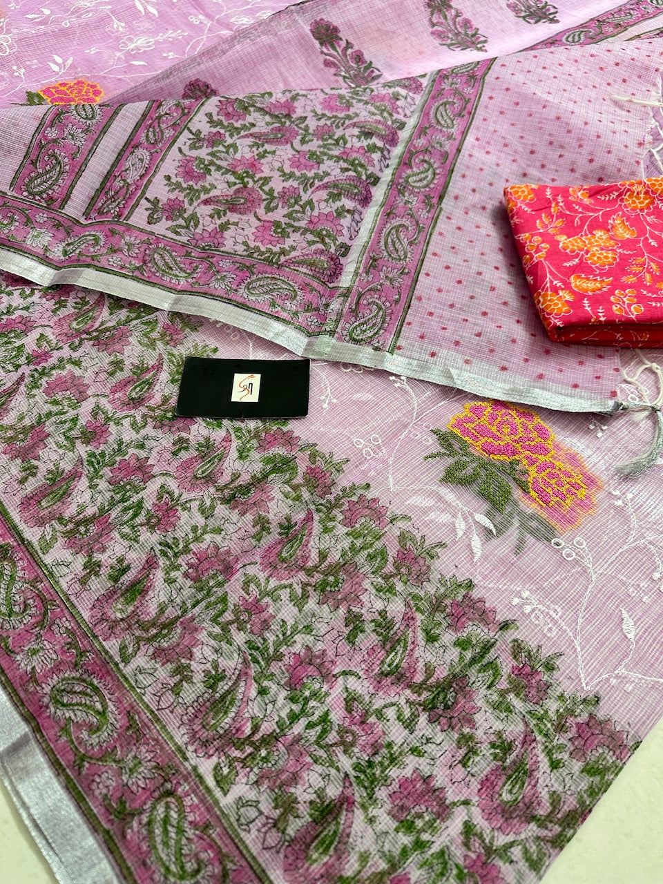 Embroidered HandBlock Printed Kota Cotton Doria Saree