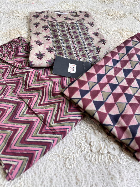 Pure HandBlock Cotton Kurti N Pant with Dupatta Set